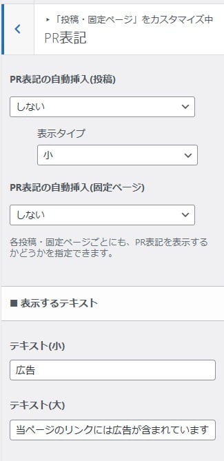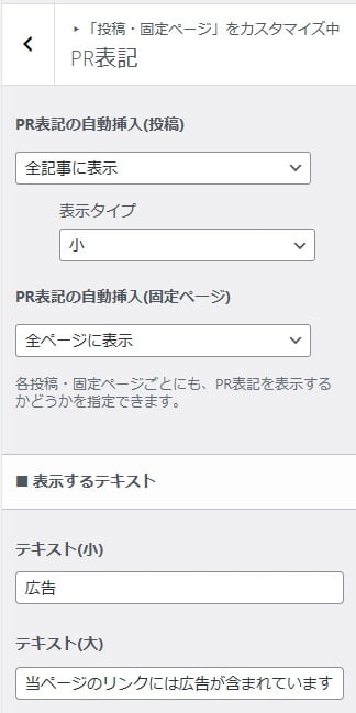 また、「PR表記」の表示サイズ - 全固定ページに対して、デフォルトで「PR表記」を挿入するのかどうか
