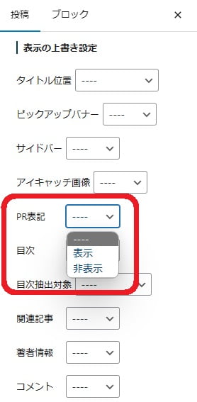 「表示の上書き設定」内に「PR表記」があるので、表示 or 非表示を選択