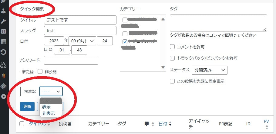 「クイック編集」の下側に「PR表記」が表示