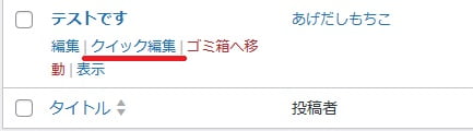 対象の投稿タイトル部分にマウスを置くと、上記のように「クイック編集」の文字が表示される